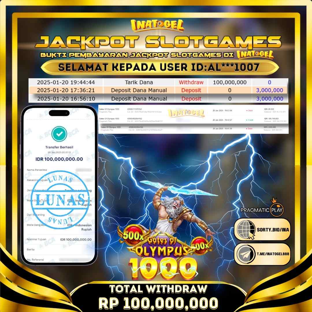 Selamat kepada UserId AL***1007 telah berhasil mendapatkan kemenangan jackpot pada permainan Slot Game Gates Of Olympus 1000 Inatogel sebesar Rp100,000,000,- . Inatogel situs terpercaya sejak dulu hingga saat ini , Untuk kemenangan berapapun pasti akan kami bayarkan . Jangan ragu bermain di Ina Togel . Kami pihak Inatogel Menyampaikan terima kasih kepada seluruh member Ina Togel yang telah Percaya dan setia Bersama kami bermain di Inatogel hingga saat ini.