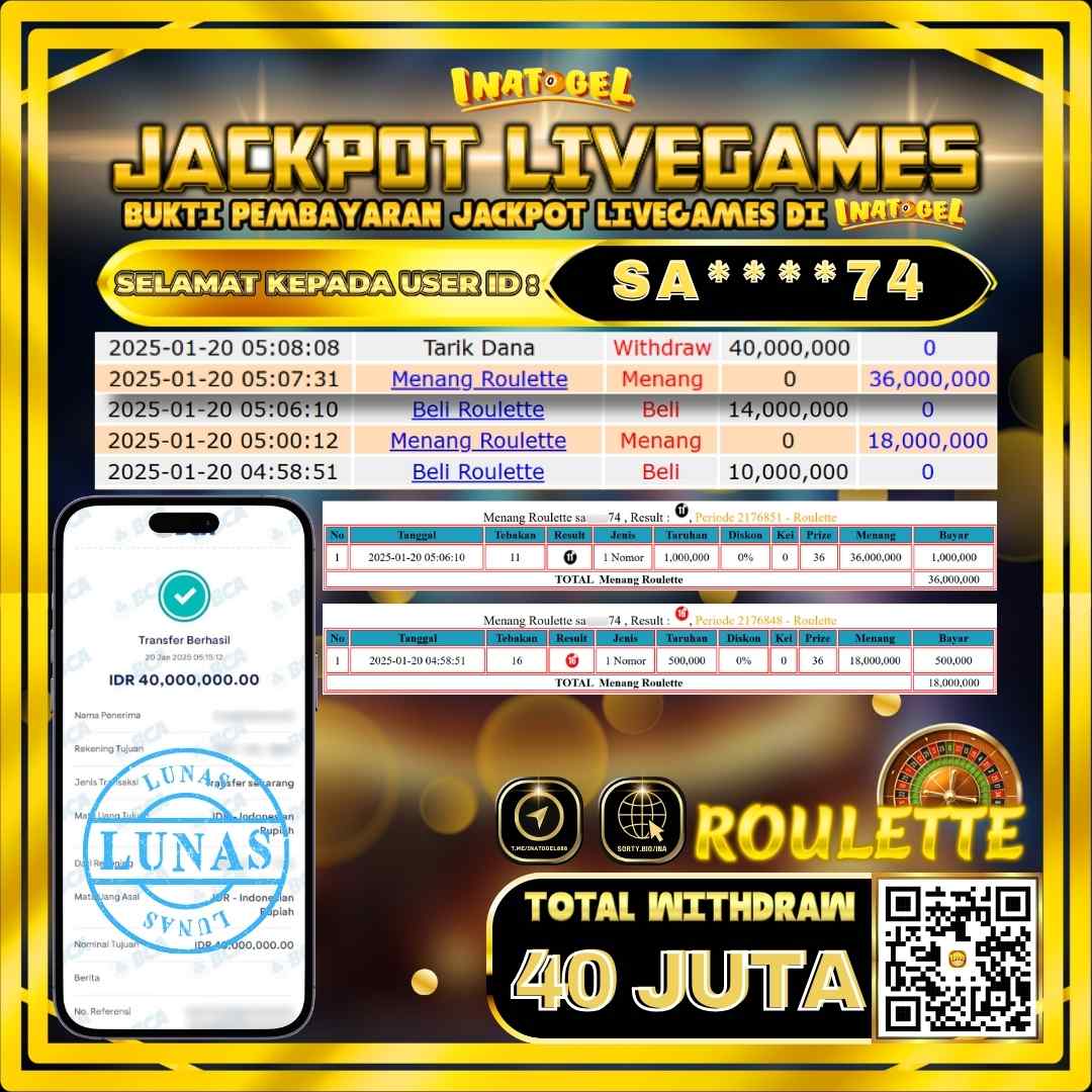 Selamat kepada UserId SA***74 telah berhasil mendapatkan kemenangan jackpot pada permainan Live Game Roulette Inatogel sebesar Rp100,000,000,- . Inatogel situs terpercaya sejak dulu hingga saat ini , Untuk kemenangan berapapun pasti akan kami bayarkan . Jangan ragu bermain di Ina Togel . Kami pihak Inatogel Menyampaikan terima kasih kepada seluruh member Ina Togel yang telah Percaya dan setia Bersama kami bermain di Inatogel hingga saat ini.