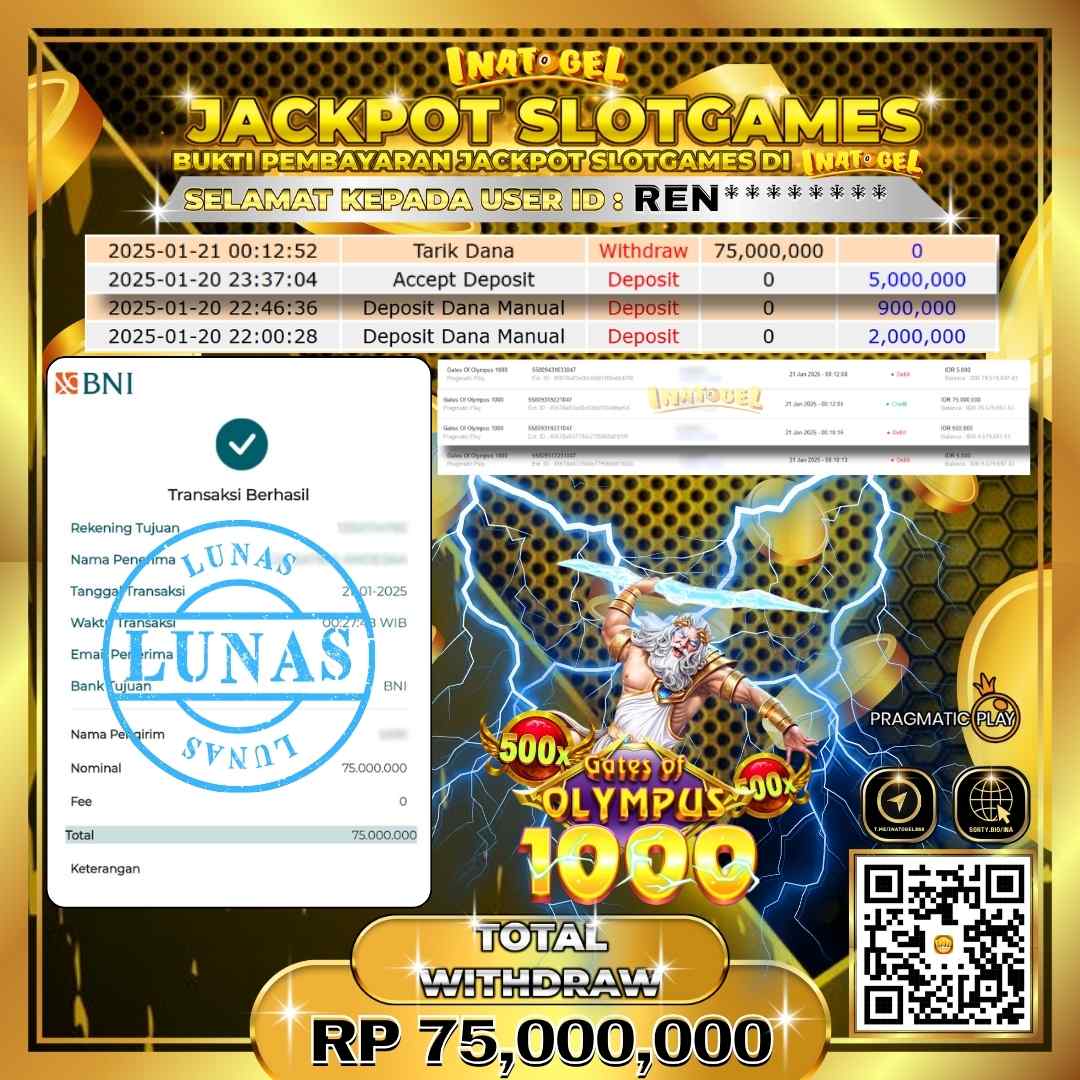 Selamat kepada UserId REN******** telah berhasil mendapatkan kemenangan jackpot pada permainan Slot Game Gates Of Olympus 1000 Inatogel sebesar Rp75,000,000,- . Inatogel situs terpercaya sejak dulu hingga saat ini , Untuk kemenangan berapapun pasti akan kami bayarkan . Jangan ragu bermain di Ina Togel . Kami pihak Inatogel Menyampaikan terima kasih kepada seluruh member Ina Togel yang telah Percaya dan setia Bersama kami bermain di Inatogel hingga saat ini.