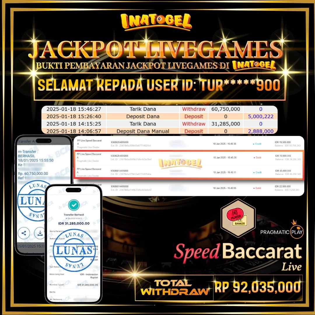 Selamat kepada UserId TUR*****900 telah berhasil mendapatkan kemenangan jackpot pada permainan Live Game PP Live Speed Baccarat A Inatogel sebesar Rp92,035,000,- . Inatogel situs terpercaya sejak dulu hingga saat ini , Untuk kemenangan berapapun pasti akan kami bayarkan . Jangan ragu bermain di Ina Togel . Kami pihak Inatogel Menyampaikan terima kasih kepada seluruh member Ina Togel yang telah Percaya dan setia Bersama kami bermain di Inatogel hingga saat ini.
