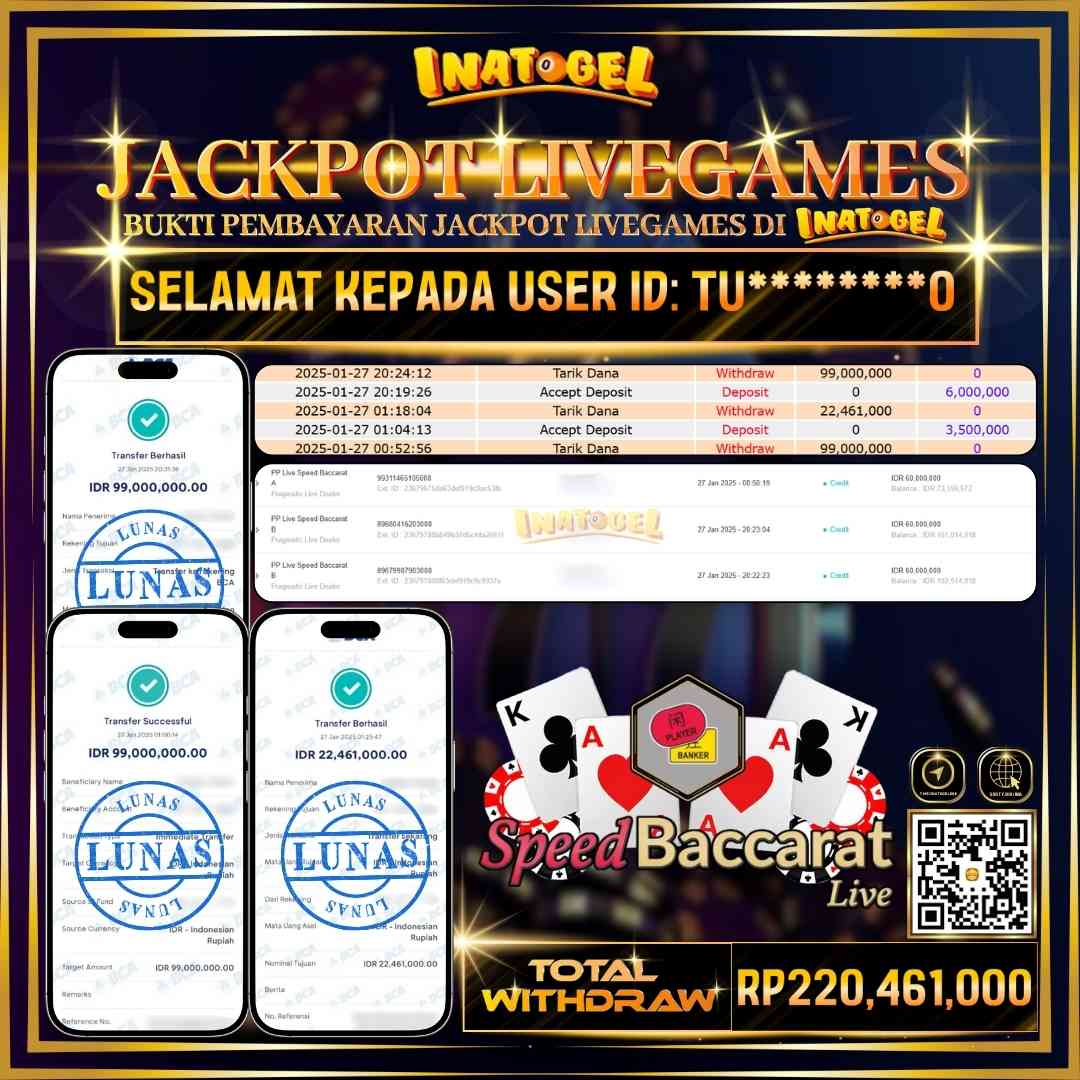 Selamat kepada UserId TU********0 telah berhasil mendapatkan kemenangan jackpot pada permainan Live Game PP Live Speed Baccarat B Inatogel sebesar Rp220,461,000,- . Inatogel situs terpercaya sejak dulu hingga saat ini , Untuk kemenangan berapapun pasti akan kami bayarkan . Jangan ragu bermain di Ina Togel . Kami pihak Inatogel Menyampaikan terima kasih kepada seluruh member Ina Togel yang telah Percaya dan setia Bersama kami bermain di Inatogel hingga saat ini.