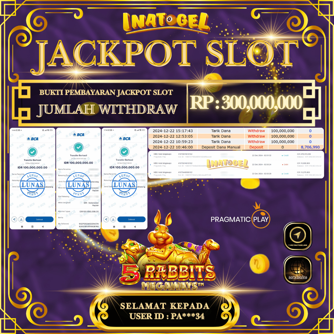 Selamat kepada UserId PA***34 telah berhasil mendapatkan kemenangan jackpot pada permainan Slot Game 5 Rabbits Megaways Inatogel sebesar Rp300,000,000,- . Inatogel situs terpercaya sejak dulu hingga saat ini , Untuk kemenangan berapapun pasti akan kami bayarkan . Jangan ragu bermain di Ina Togel . Kami pihak Inatogel Menyampaikan terima kasih kepada seluruh member Ina Togel yang telah Percaya dan setia Bersama kami bermain di Inatogel hingga saat ini