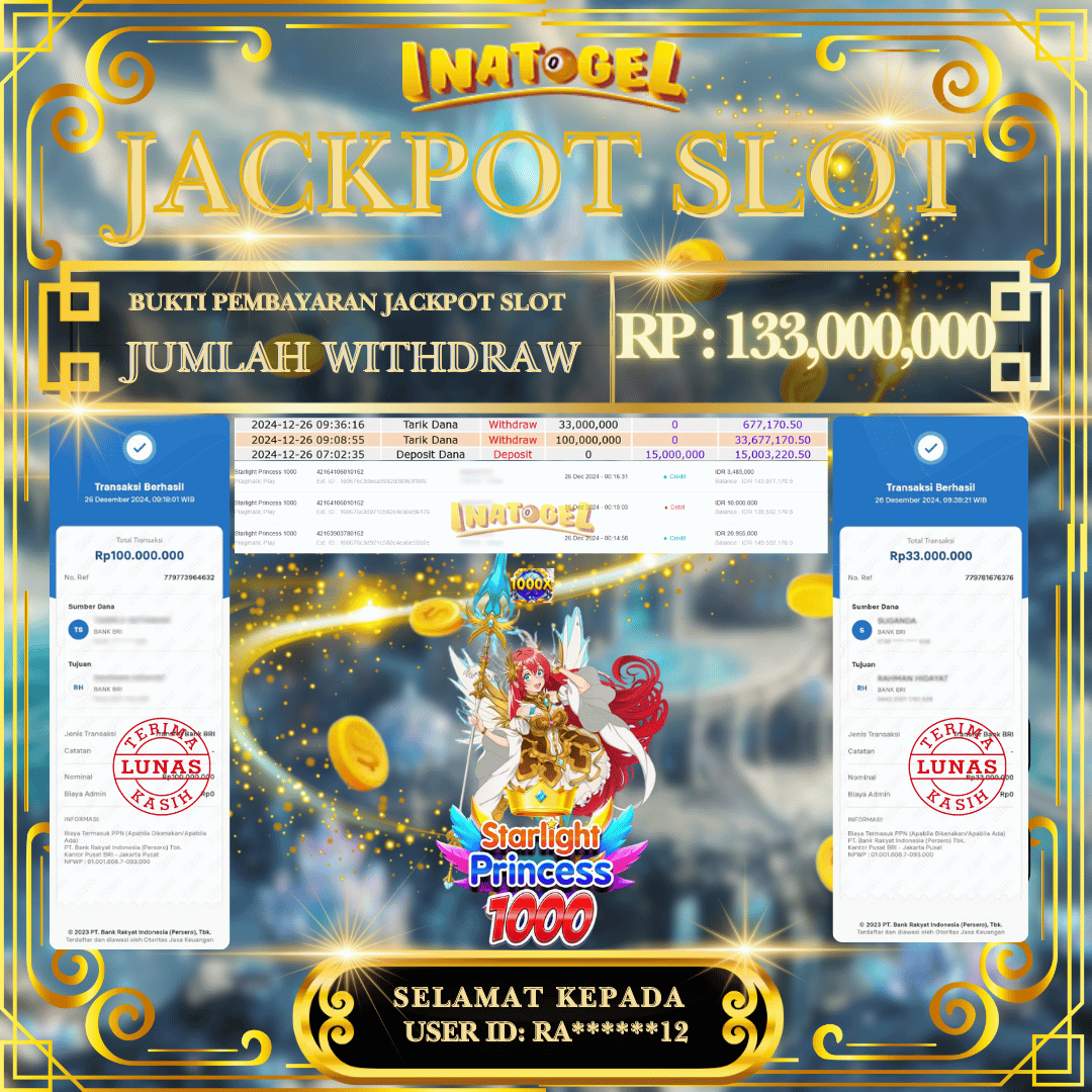 Selamat kepada UserId RA******12 telah berhasil mendapatkan kemenangan jackpot pada permainan Slot Game Starlight Princess 1000 Inatogel sebesar Rp133,000,000,- . Inatogel situs terpercaya sejak dulu hingga saat ini , Untuk kemenangan berapapun pasti akan kami bayarkan . Jangan ragu bermain di Ina Togel . Kami pihak Inatogel Menyampaikan terima kasih kepada seluruh member Ina Togel yang telah Percaya dan setia Bersama kami bermain di Inatogel hingga saat ini.