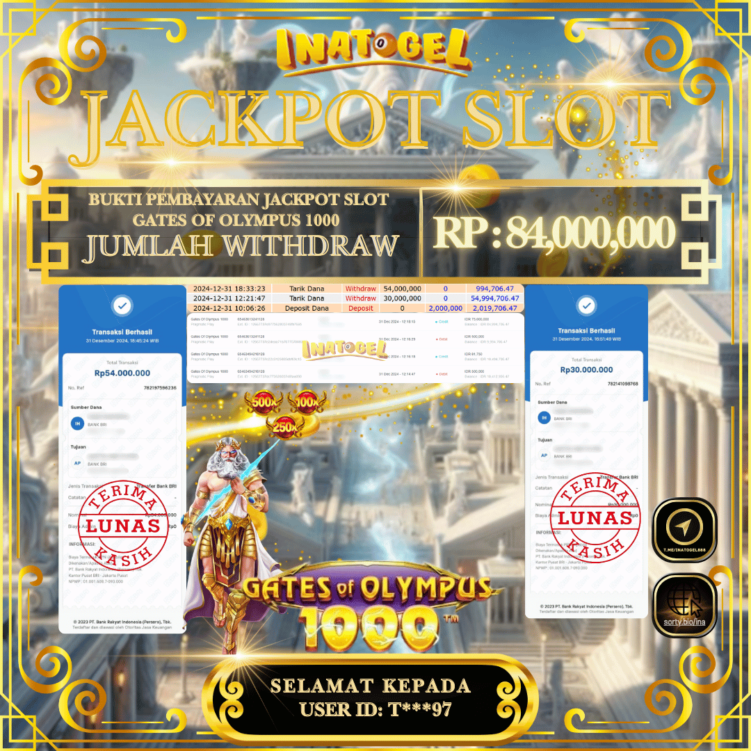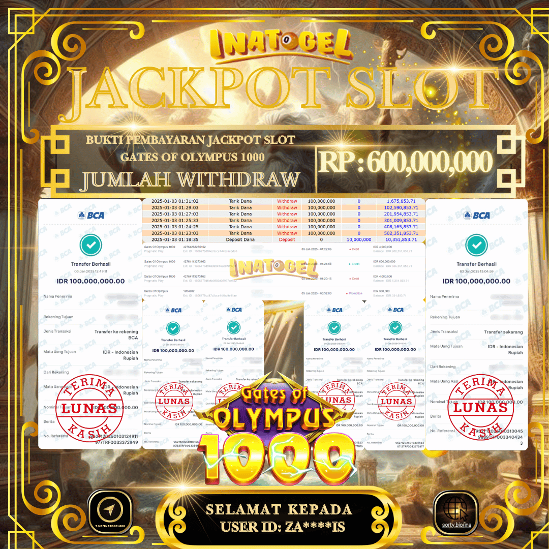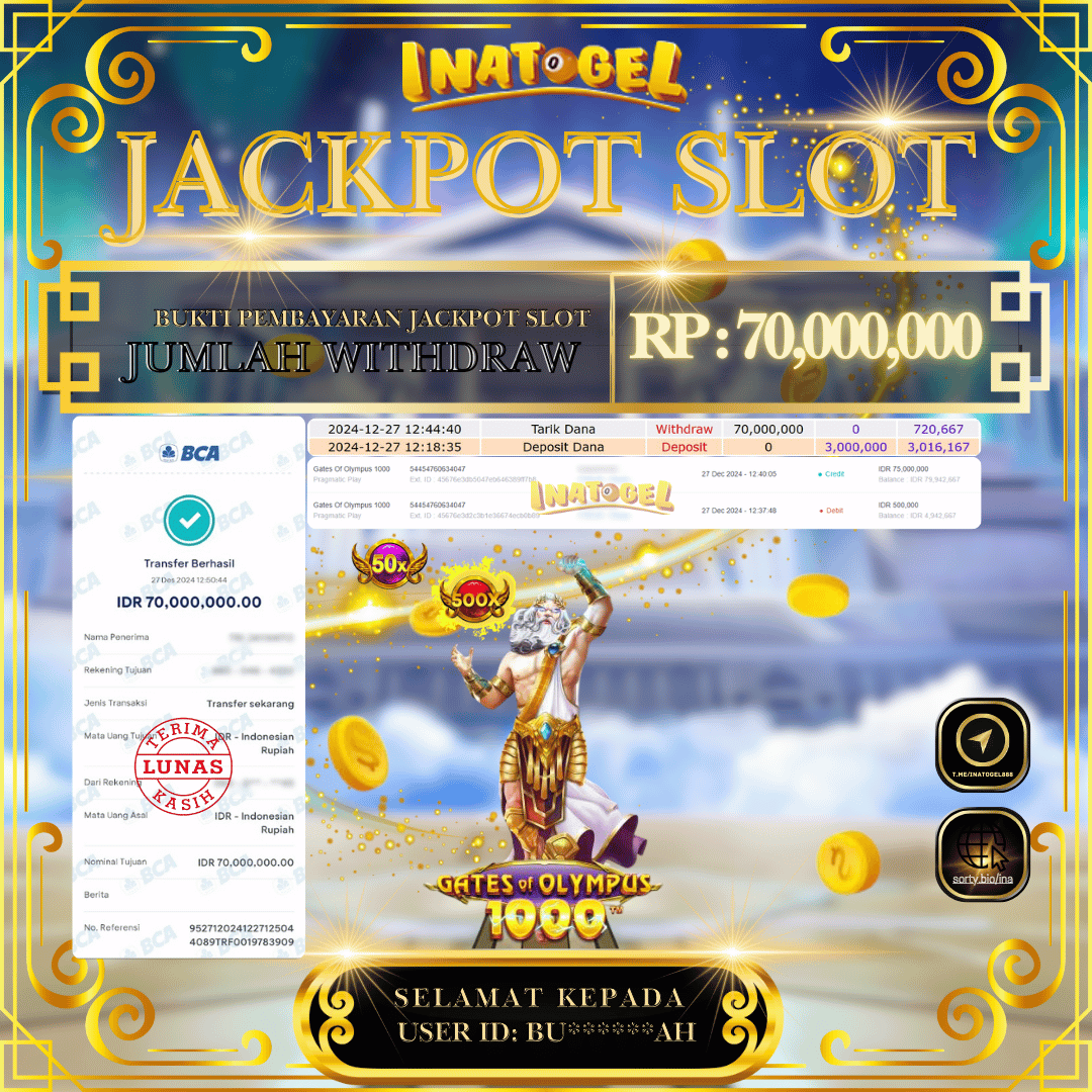 Selamat kepada UserId BU******AH telah berhasil mendapatkan kemenangan jackpot pada permainan Slot Game Gates Of Olympus 1000 Inatogel sebesar Rp70,000,000,- . Inatogel situs terpercaya sejak dulu hingga saat ini , Untuk kemenangan berapapun pasti akan kami bayarkan . Jangan ragu bermain di Ina Togel . Kami pihak Inatogel Menyampaikan terima kasih kepada seluruh member Ina Togel yang telah Percaya dan setia Bersama kami bermain di Inatogel hingga saat ini.