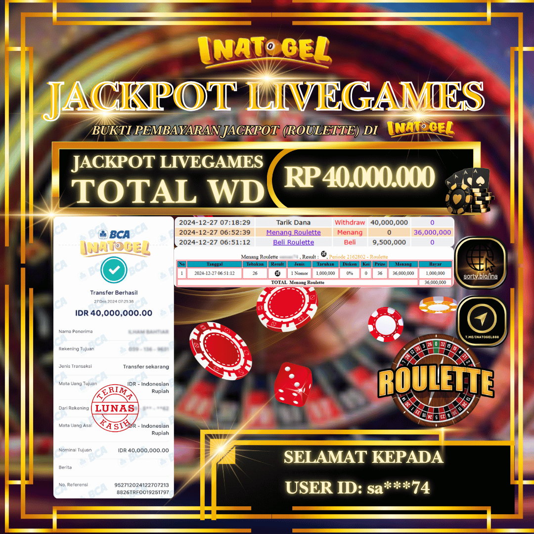 Selamat kepada UserId SA***74 telah berhasil mendapatkan kemenangan jackpot pada permainan Live Games Roulette Inatogel sebesar Rp40,000,000,- . Inatogel situs terpercaya sejak dulu hingga saat ini , Untuk kemenangan berapapun pasti akan kami bayarkan . Jangan ragu bermain di Ina Togel . Kami pihak Inatogel Menyampaikan terima kasih kepada seluruh member Ina Togel yang telah Percaya dan setia Bersama kami bermain di Inatogel hingga saat ini