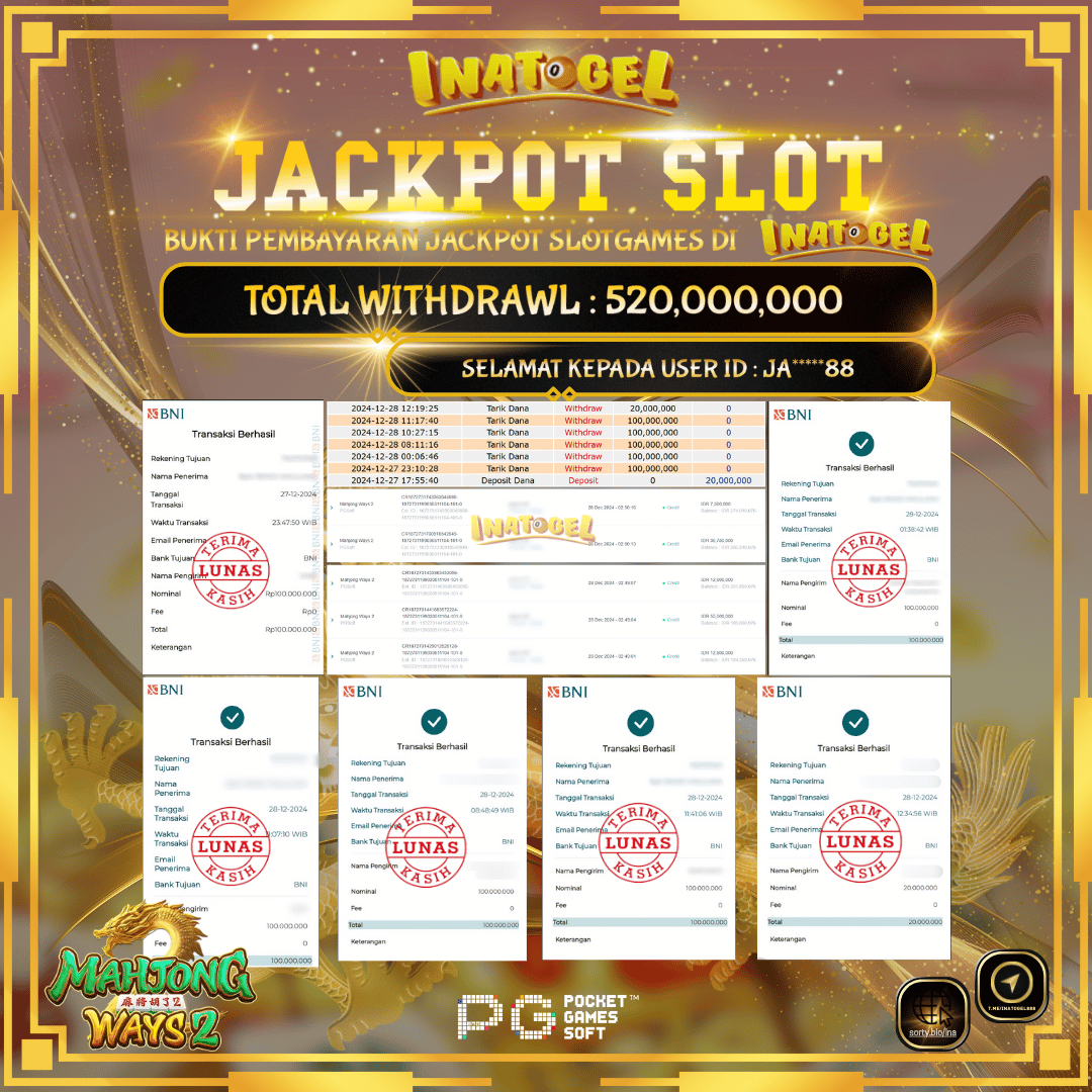 Selamat kepada UserId JA*****88 telah berhasil mendapatkan kemenangan jackpot pada permainan Slot Game Mahjong Ways 2 Inatogel sebesar Rp520,000,000,- . Inatogel situs terpercaya sejak dulu hingga saat ini , Untuk kemenangan berapapun pasti akan kami bayarkan . Jangan ragu bermain di Ina Togel . Kami pihak Inatogel Menyampaikan terima kasih kepada seluruh member Ina Togel yang telah Percaya dan setia Bersama kami bermain di Inatogel hingga saat ini.