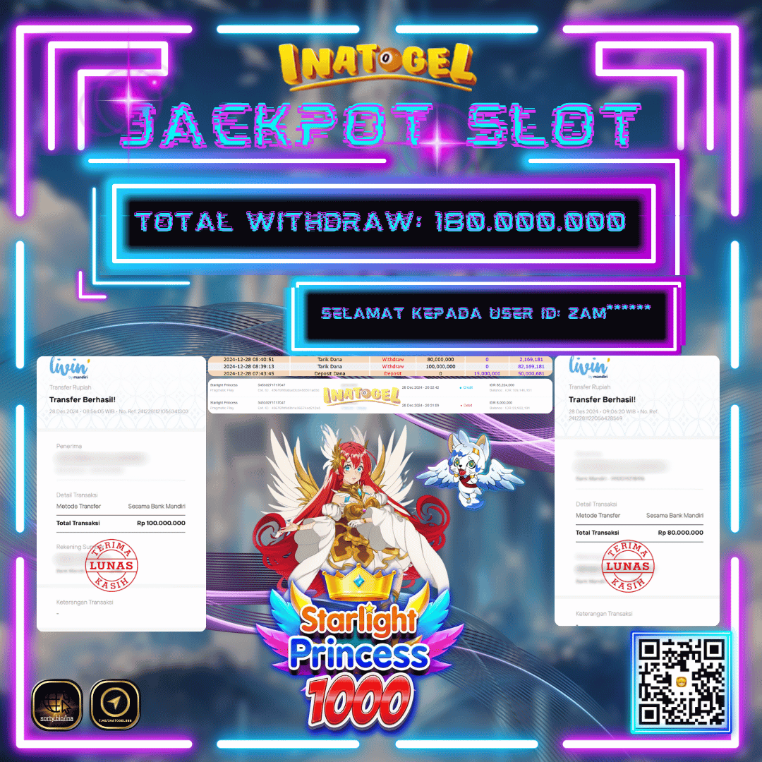 Selamat kepada UserId ZAM****** telah berhasil mendapatkan kemenangan jackpot pada permainan Slot Game Starlight Princess 1000 Inatogel sebesar Rp180,000,000,- . Inatogel situs terpercaya sejak dulu hingga saat ini , Untuk kemenangan berapapun pasti akan kami bayarkan . Jangan ragu bermain di Ina Togel . Kami pihak Inatogel Menyampaikan terima kasih kepada seluruh member Ina Togel yang telah Percaya dan setia Bersama kami bermain di Inatogel hingga saat ini.