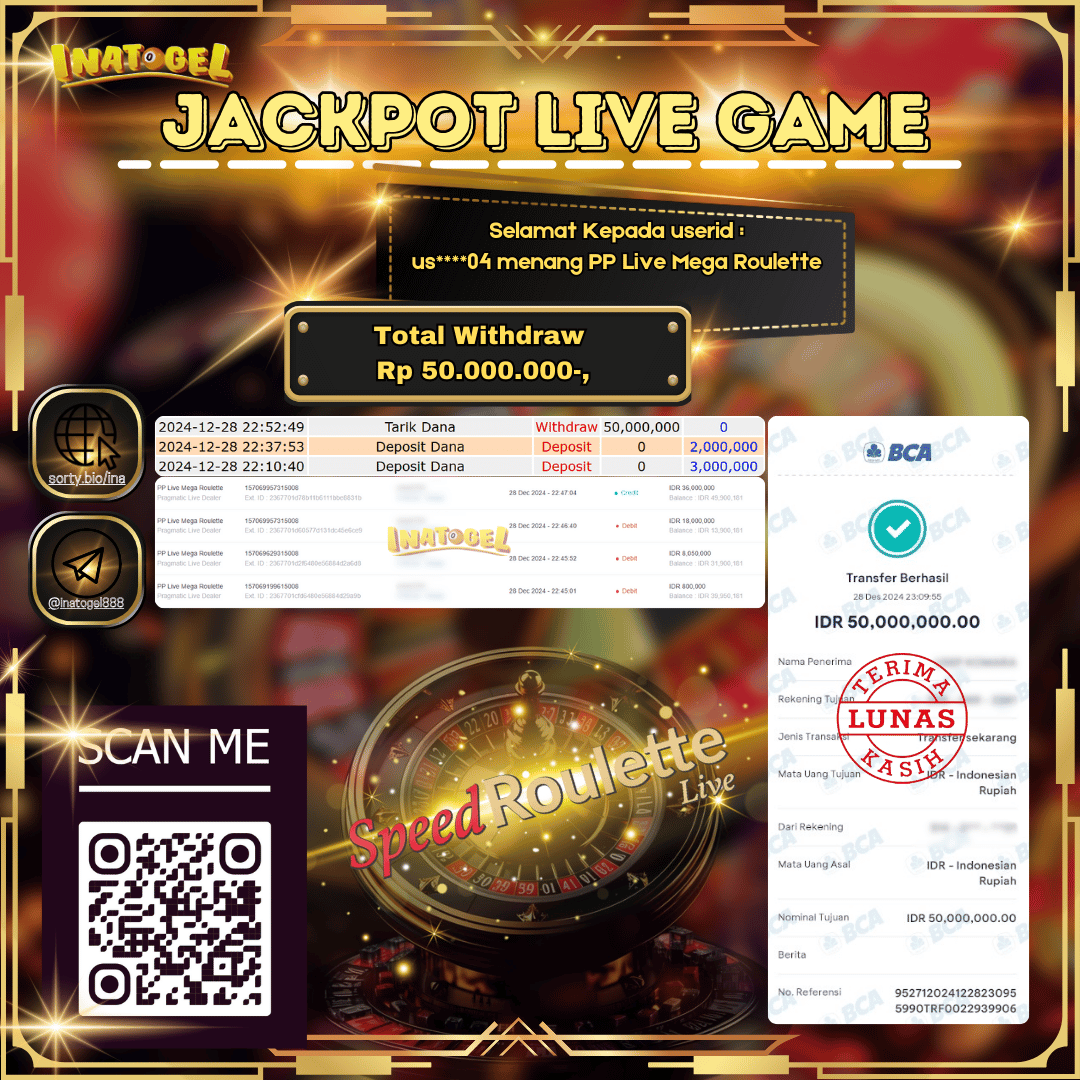 Selamat kepada UserId US****04 telah berhasil mendapatkan kemenangan jackpot pada permainan Live Games PP Live Mega Roulette Inatogel sebesar Rp50,000,000,- . Inatogel situs terpercaya sejak dulu hingga saat ini , Untuk kemenangan berapapun pasti akan kami bayarkan . Jangan ragu bermain di Ina Togel . Kami pihak Inatogel Menyampaikan terima kasih kepada seluruh member Ina Togel yang telah Percaya dan setia Bersama kami bermain di Inatogel hingga saat ini