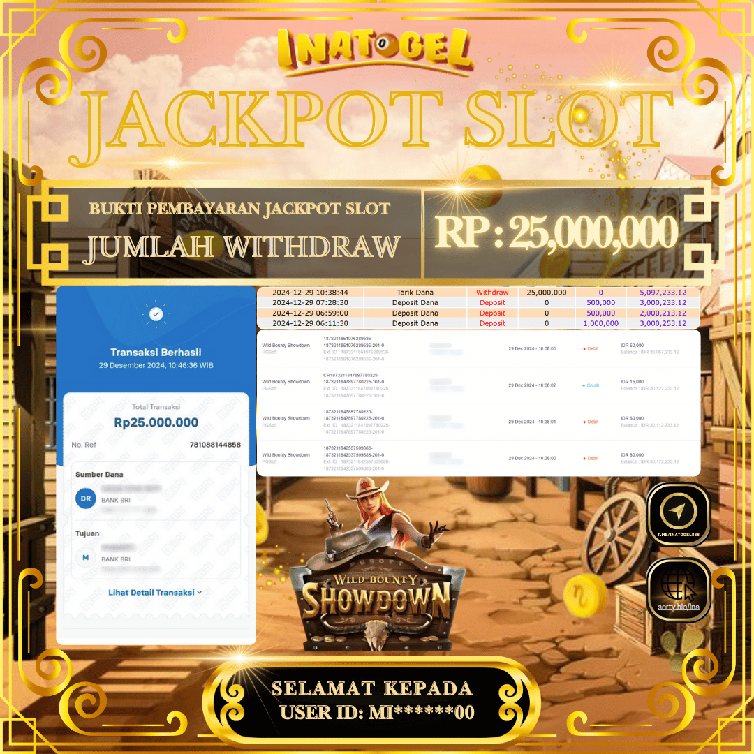 Selamat kepada UserId MI******00 telah berhasil mendapatkan kemenangan jackpot pada permainan Slot Game Wild Bounty Showdown Inatogel sebesar Rp25,000,000,- . Inatogel situs terpercaya sejak dulu hingga saat ini , Untuk kemenangan berapapun pasti akan kami bayarkan . Jangan ragu bermain di Ina Togel . Kami pihak Inatogel Menyampaikan terima kasih kepada seluruh member Ina Togel yang telah Percaya dan setia Bersama kami bermain di Inatogel hingga saat ini.