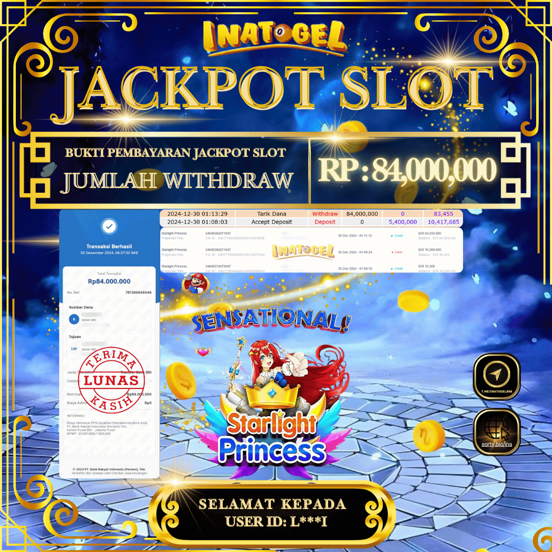 Selamat kepada UserId L***I telah berhasil mendapatkan kemenangan jackpot pada permainan Slot Game Starlight Princess Inatogel sebesar Rp84,000,000,- . Inatogel situs terpercaya sejak dulu hingga saat ini , Untuk kemenangan berapapun pasti akan kami bayarkan . Jangan ragu bermain di Ina Togel . Kami pihak Inatogel Menyampaikan terima kasih kepada seluruh member Ina Togel yang telah Percaya dan setia Bersama kami bermain di Inatogel hingga saat ini.