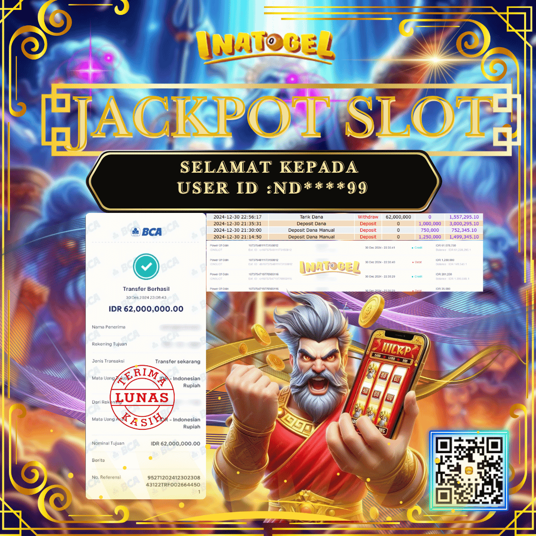 Selamat kepada UserId ND****99 telah berhasil mendapatkan kemenangan jackpot pada permainan Slot Game Power Of Odin Inatogel sebesar Rp62,000,000,- . Inatogel situs terpercaya sejak dulu hingga saat ini , Untuk kemenangan berapapun pasti akan kami bayarkan . Jangan ragu bermain di Ina Togel . Kami pihak Inatogel Menyampaikan terima kasih kepada seluruh member Ina Togel yang telah Percaya dan setia Bersama kami bermain di Inatogel hingga saat ini.