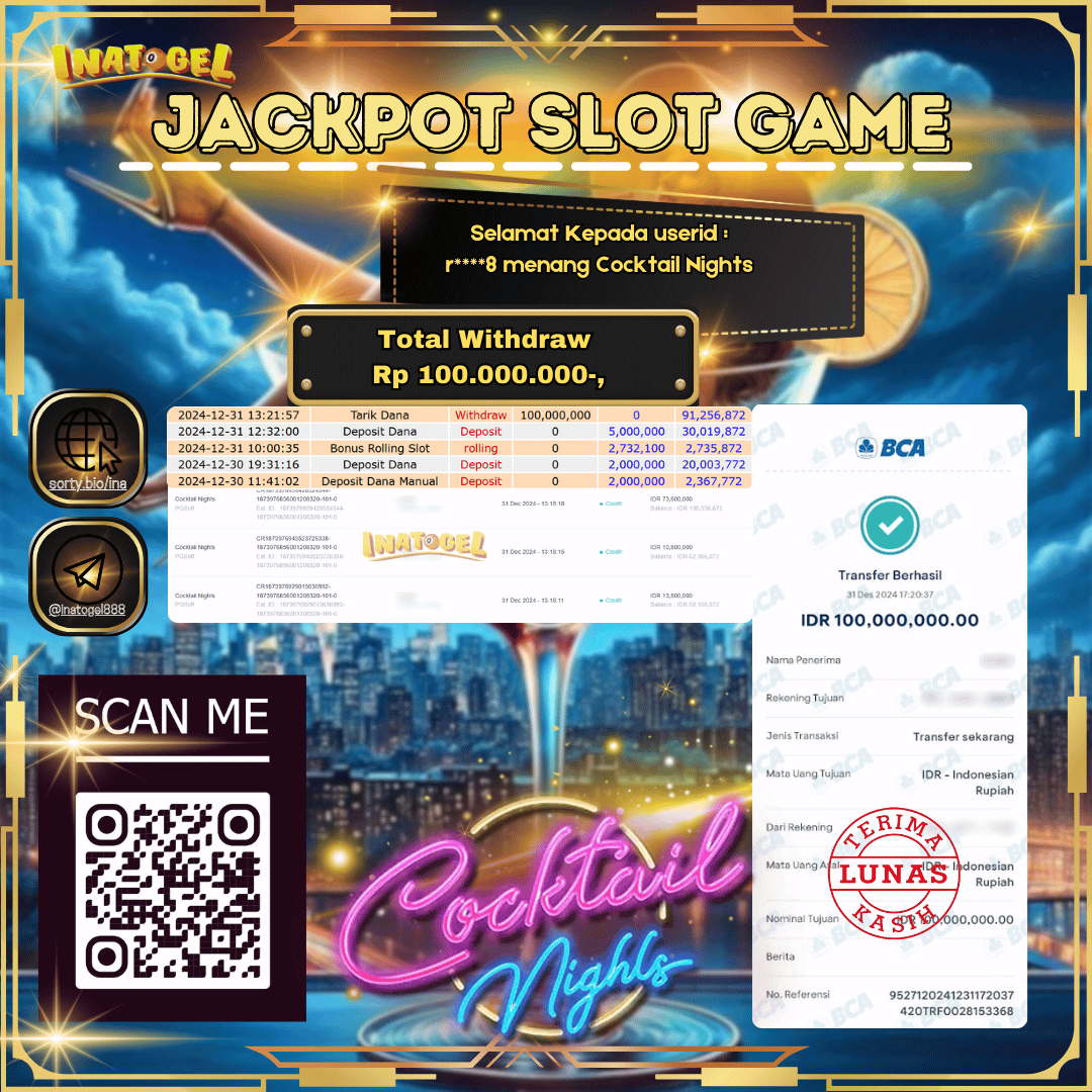 Selamat kepada UserId R****8 telah berhasil mendapatkan kemenangan jackpot pada permainan Slot Game Cocktail Nights Inatogel sebesar Rp100,000,000,- . Inatogel situs terpercaya sejak dulu hingga saat ini , Untuk kemenangan berapapun pasti akan kami bayarkan . Jangan ragu bermain di Ina Togel . Kami pihak Inatogel Menyampaikan terima kasih kepada seluruh member Ina Togel yang telah Percaya dan setia Bersama kami bermain di Inatogel hingga saat ini.