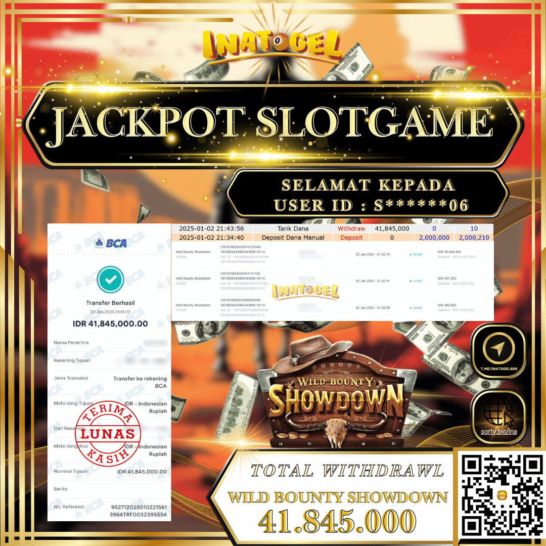 Selamat kepada UserId S******06 telah berhasil mendapatkan kemenangan jackpot pada permainan Slot Game Wild Bounty Showdown Inatogel sebesar Rp41,845,000,- . Inatogel situs terpercaya sejak dulu hingga saat ini , Untuk kemenangan berapapun pasti akan kami bayarkan . Jangan ragu bermain di Ina Togel . Kami pihak Inatogel Menyampaikan terima kasih kepada seluruh member Ina Togel yang telah Percaya dan setia Bersama kami bermain di Inatogel hingga saat ini.