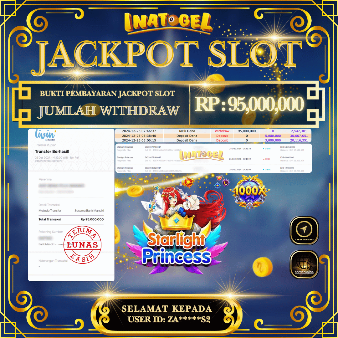Selamat kepada UserId ZA*****S2 telah berhasil mendapatkan kemenangan jackpot pada permainan Slot Game Starlight Princess Inatogel sebesar Rp95,000,000,- . Inatogel situs terpercaya sejak dulu hingga saat ini , Untuk kemenangan berapapun pasti akan kami bayarkan . Jangan ragu bermain di Ina Togel . Kami pihak Inatogel Menyampaikan terima kasih kepada seluruh member Ina Togel yang telah Percaya dan setia Bersama kami bermain di Inatogel hingga saat ini.
