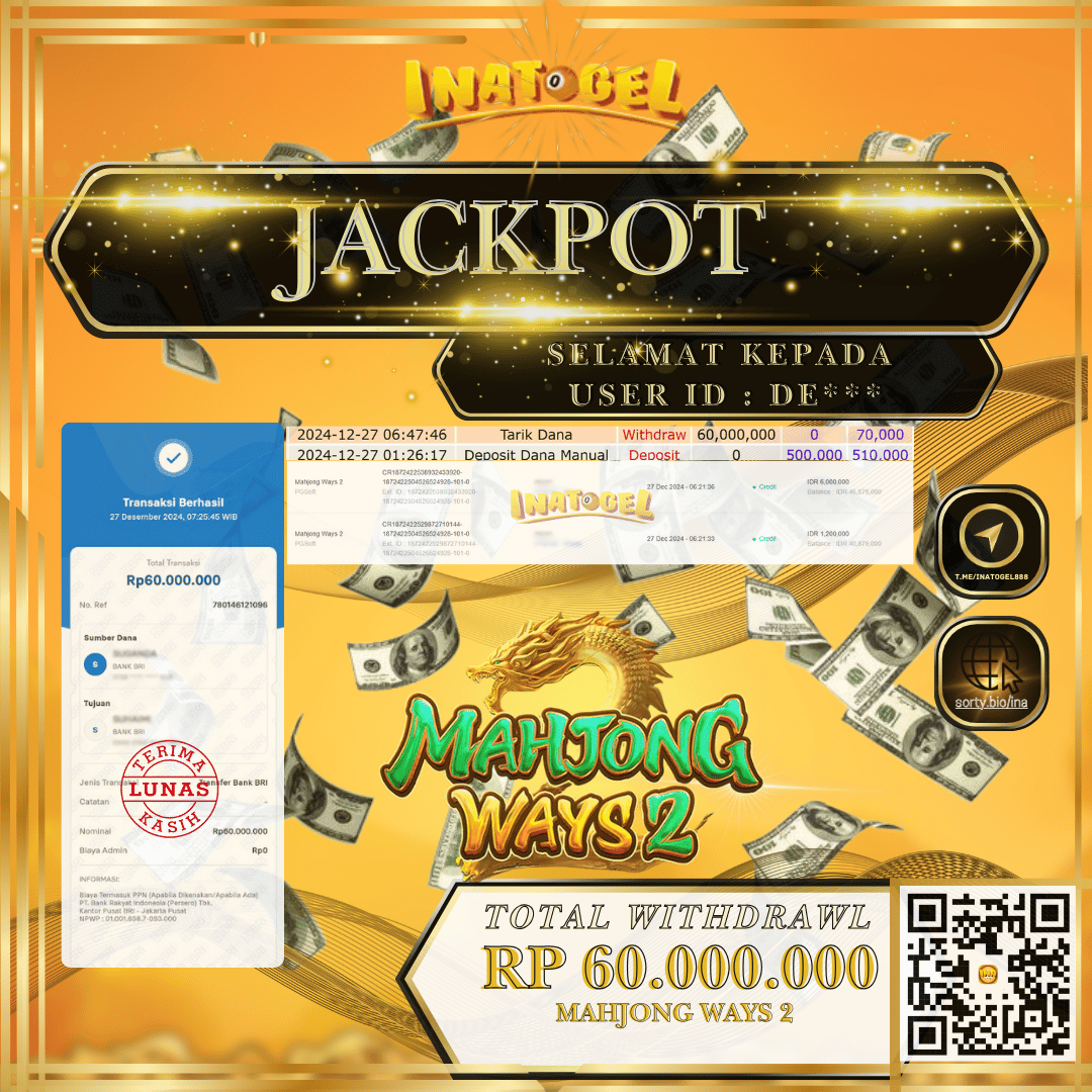 Selamat kepada UserId DE*** telah berhasil mendapatkan kemenangan jackpot pada permainan Slot Game Mahjong Ways2 Inatogel sebesar Rp60,000,000,- . Inatogel situs terpercaya sejak dulu hingga saat ini , Untuk kemenangan berapapun pasti akan kami bayarkan . Jangan ragu bermain di Ina Togel . Kami pihak Inatogel Menyampaikan terima kasih kepada seluruh member Ina Togel yang telah Percaya dan setia Bersama kami bermain di Inatogel hingga saat ini