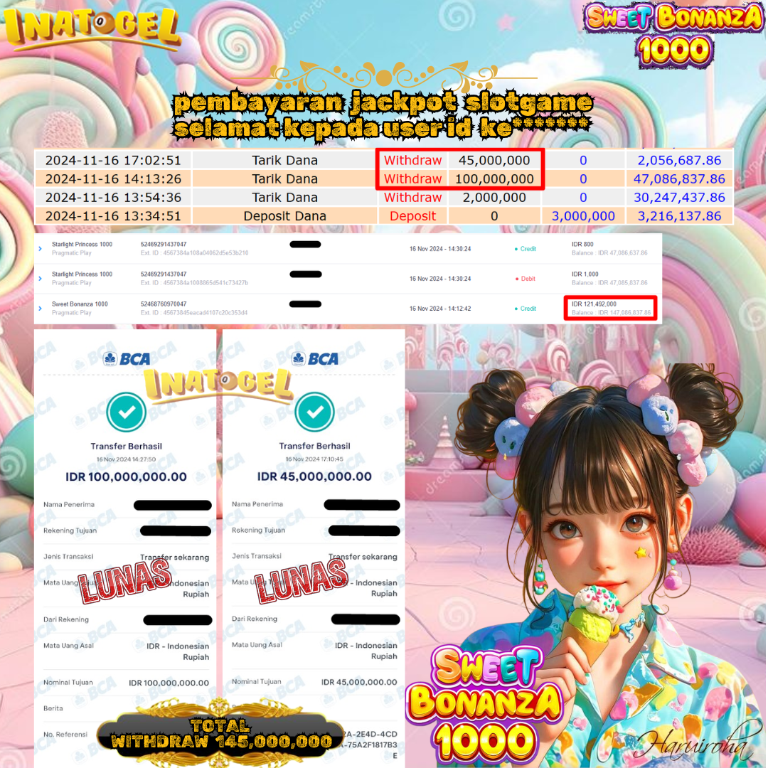 Selamat kepada UserId Kexxxxxxx telah berhasil mendapatkan kemenangan jackpot pada permainan Slot Game Sweet Bonanza 1000 Inatogel sebesar Rp145,000,000,- . Inatogel situs terpercaya sejak dulu hingga saat ini , Untuk kemenangan berapapun pasti akan kami bayarkan . Jangan ragu bermain di Ina Togel . Kami pihak Inatogel Menyampaikan terima kasih kepada seluruh member Ina Togel yang telah Percaya dan setia Bersama kami bermain di Inatogel hingga saat ini