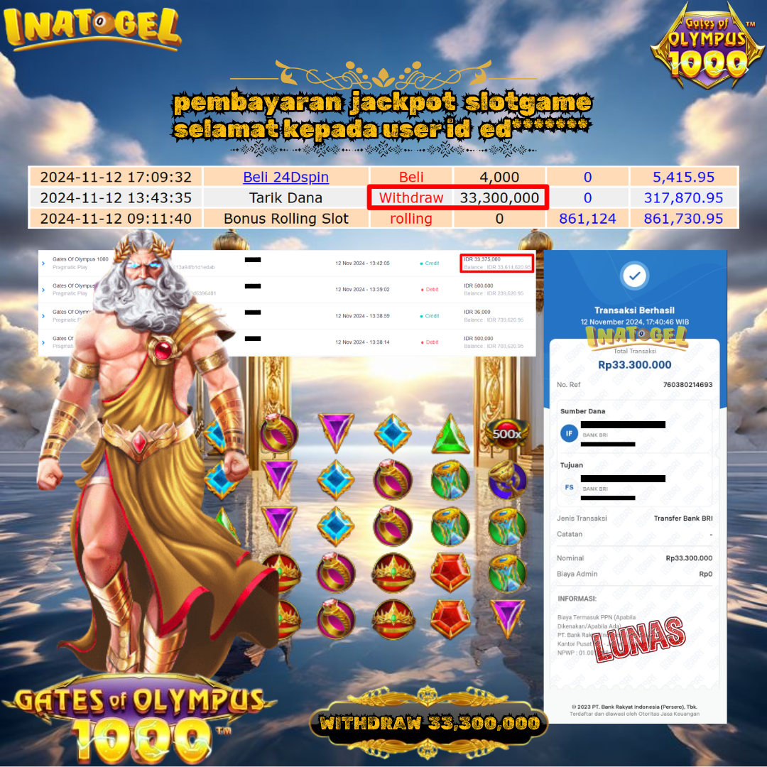 Inatogel Jackpot Slot Game Gates Of Olympus 1000 Rp33,000,000