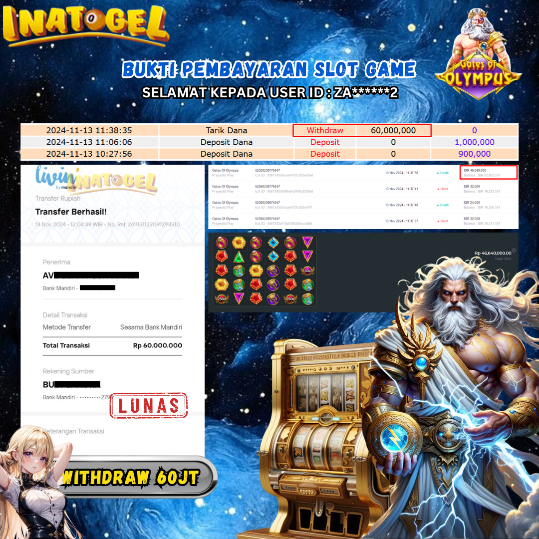 Inatogel Jackpot Slot Game Gates Of Olympus Rp60,000,000
