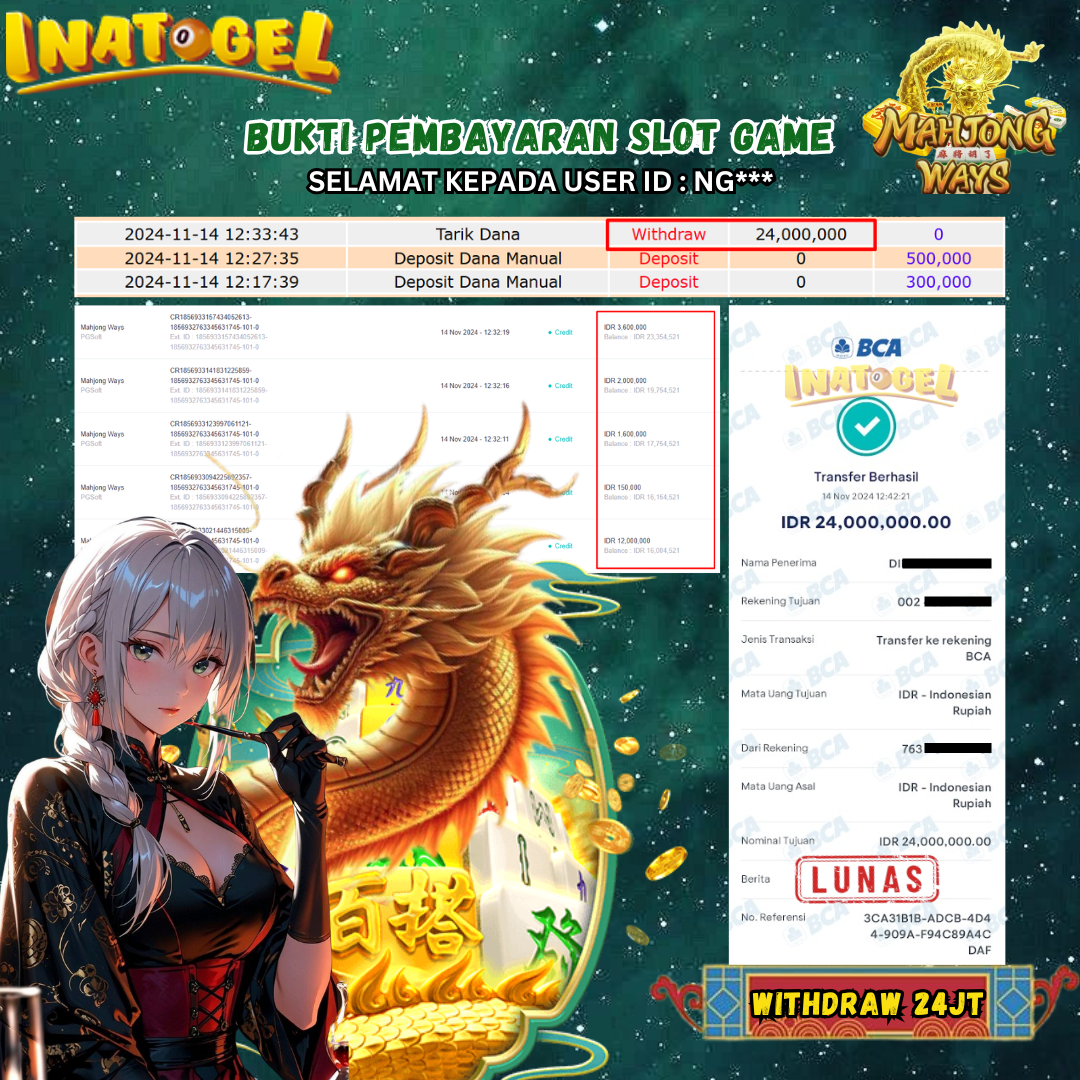 Selamat kepada UserId Ngxxx telah berhasil mendapatkan kemenangan jackpot pada permainan Slot Game Mahjong Ways Inatogel sebesar Rp24,000,000,- . Inatogel situs terpercaya sejak dulu hingga saat ini , Untuk kemenangan berapapun pasti akan kami bayarkan . Jangan ragu bermain di Ina Togel . Kami pihak Inatogel Menyampaikan terima kasih kepada seluruh member Ina Togel yang telah Percaya dan setia Bersama kami bermain di Inatogel hingga saat ini
