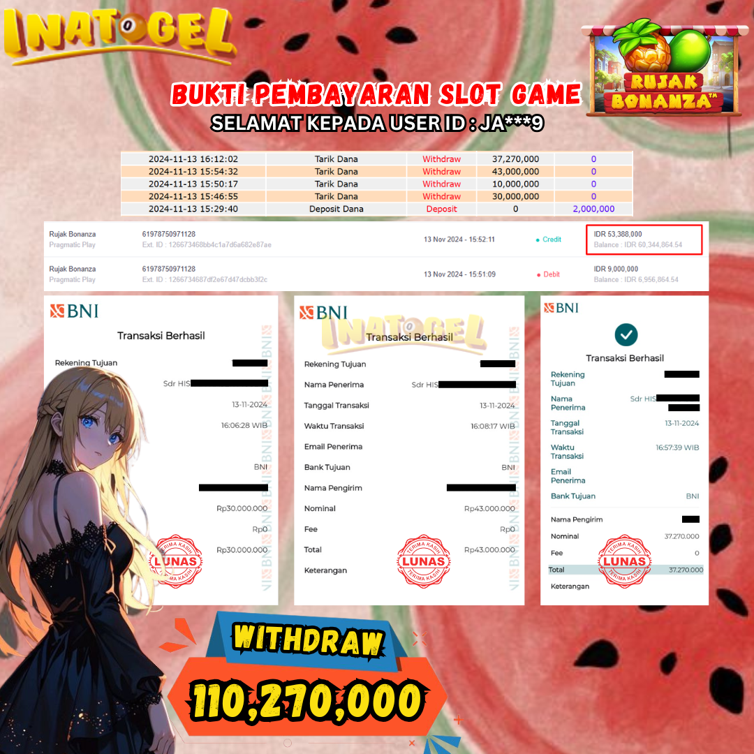 Selamat kepada UserId Jaxxx9 telah berhasil mendapatkan kemenangan jackpot pada permainan Slot Game Rujak Bonanza Inatogel sebesar Rp110,270,000,- . Inatogel situs terpercaya sejak dulu hingga saat ini , Untuk kemenangan berapapun pasti akan kami bayarkan . Jangan ragu bermain di Ina Togel . Kami pihak Inatogel Menyampaikan terima kasih kepada seluruh member Ina Togel yang telah Percaya dan setia Bersama kami bermain di Inatogel hingga saat ini
