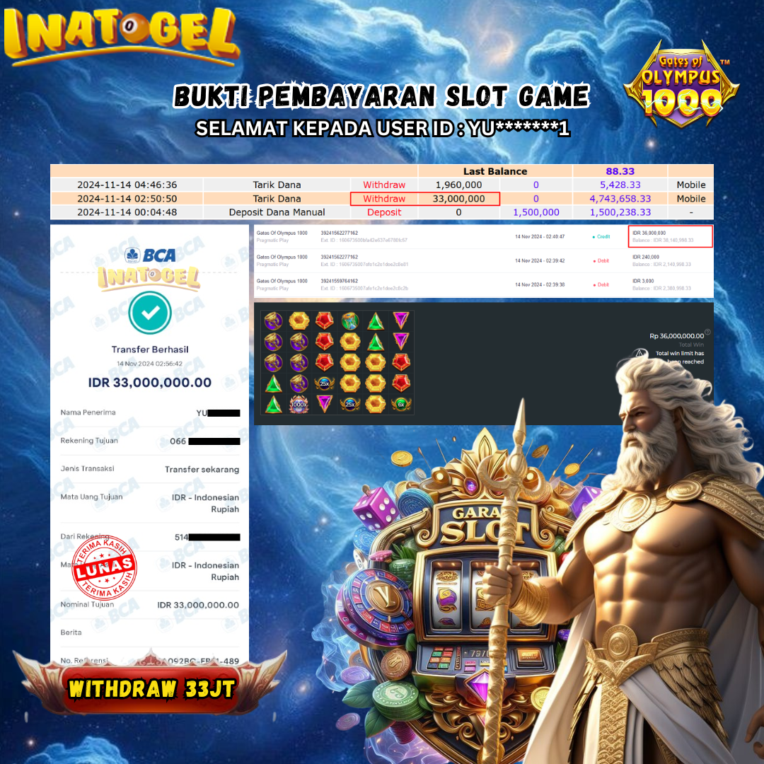 Selamat kepada UserId Edxxxxxxx telah berhasil mendapatkan kemenangan jackpot pada permainan Slot Game Gates Of Olympus 1000 Inatogel sebesar Rp33,300,000,- . Inatogel situs terpercaya sejak dulu hingga saat ini , Untuk kemenangan berapapun pasti akan kami bayarkan . Jangan ragu bermain di Ina Togel . Kami pihak Inatogel Menyampaikan terima kasih kepada seluruh member Ina Togel yang telah Percaya dan setia Bersama kami bermain di Inatogel hingga saat ini
