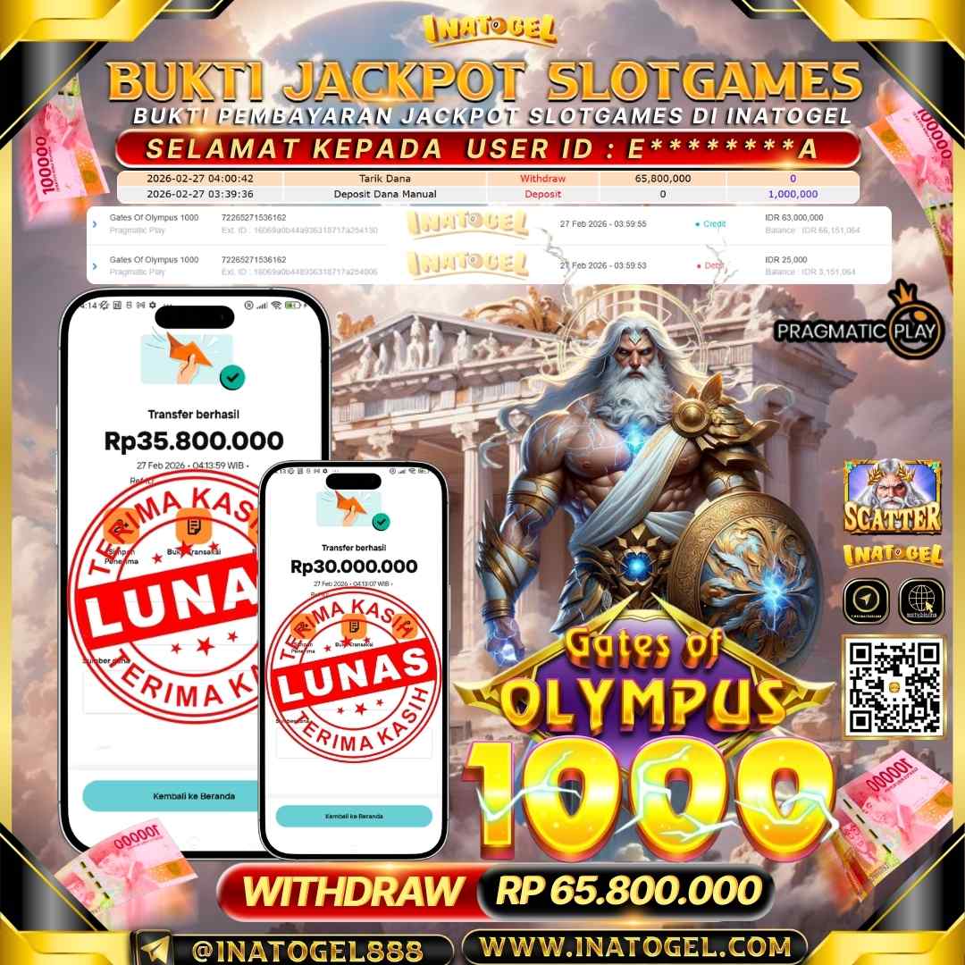 Selamat kepada User Id E********A telah berhasil mendapatkan kemenangan jackpot pada permainan Slot Games Gates Of Olympus 1000 sebesar Rp 65,800,000- . Inatogel situs terpercaya sejak dulu hingga saat ini , Untuk kemenangan berapapun pasti akan kami bayarkan . Jangan ragu bermain di Ina Togel . Kami pihak Inatogel Menyampaikan terima kasih kepada seluruh member Ina Togel yang telah Percaya dan setia Bersama kami bermain di Inatogel saat ini.