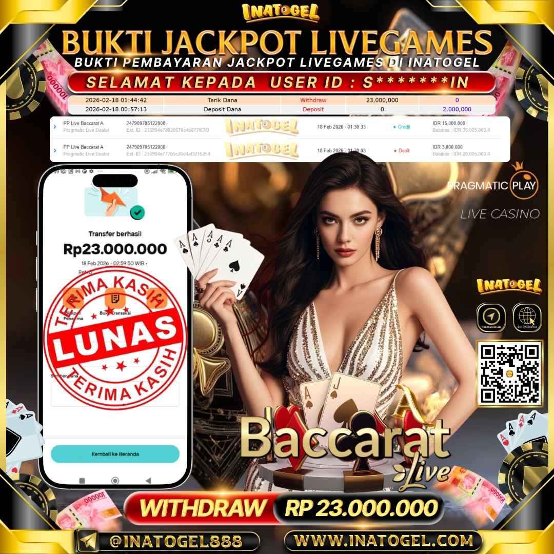 Selamat kepada User Id S*******IN telah berhasil mendapatkan kemenangan jackpot pada permainan Live Game PP Live Baccarat A Inatogel sebesar Rp23,000,000,- Inatogel situs terpercaya sejak dulu hingga saat ini , Untuk kemenangan berapapun pasti akan kami bayarkan . Jangan ragu bermain di Ina Togel . Kami pihak Inatogel Menyampaikan terima kasih kepada seluruh member Ina Togel yang telah Percaya dan setia Bersama kami bermain di Inatogel hingga saat ini.