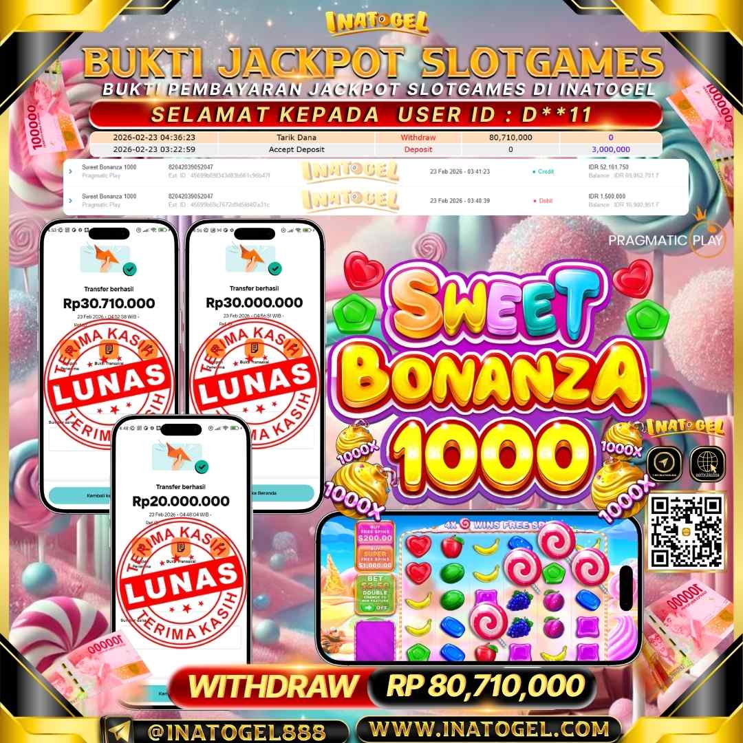 Selamat kepada User Id D**11 telah berhasil mendapatkan kemenangan jackpot pada permainan Slot Games Sweet Bonanza 1000 sebesar Rp 80,710,000 Inatogel situs terpercaya sejak dulu hingga saat ini , Untuk kemenangan berapapun pasti akan kami bayarkan . Jangan ragu bermain di Ina Togel . Kami pihak Inatogel Menyampaikan terima kasih kepada seluruh member Ina Togel yang telah Percaya dan setia Bersama kami bermain di Inatogel saat ini.