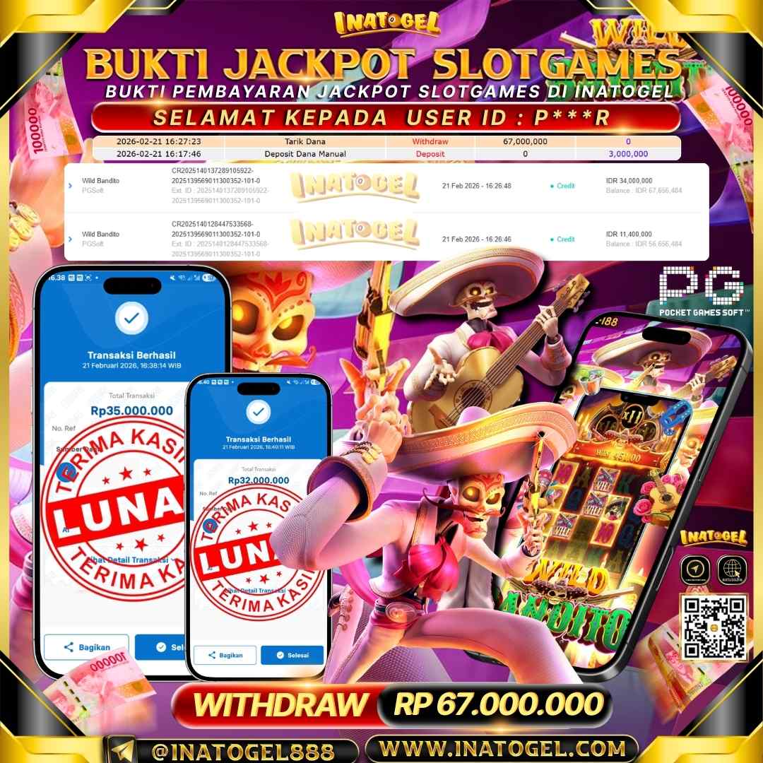 Selamat kepada User Id P***R telah berhasil mendapatkan kemenangan jackpot pada permainan Slot Games Wild Bandito sebesar Rp 67,000,000- . Inatogel situs terpercaya sejak dulu hingga saat ini , Untuk kemenangan berapapun pasti akan kami bayarkan . Jangan ragu bermain di Ina Togel . Kami pihak Inatogel Menyampaikan terima kasih kepada seluruh member Ina Togel yang telah Percaya dan setia Bersama kami bermain di Inatogel saat ini.