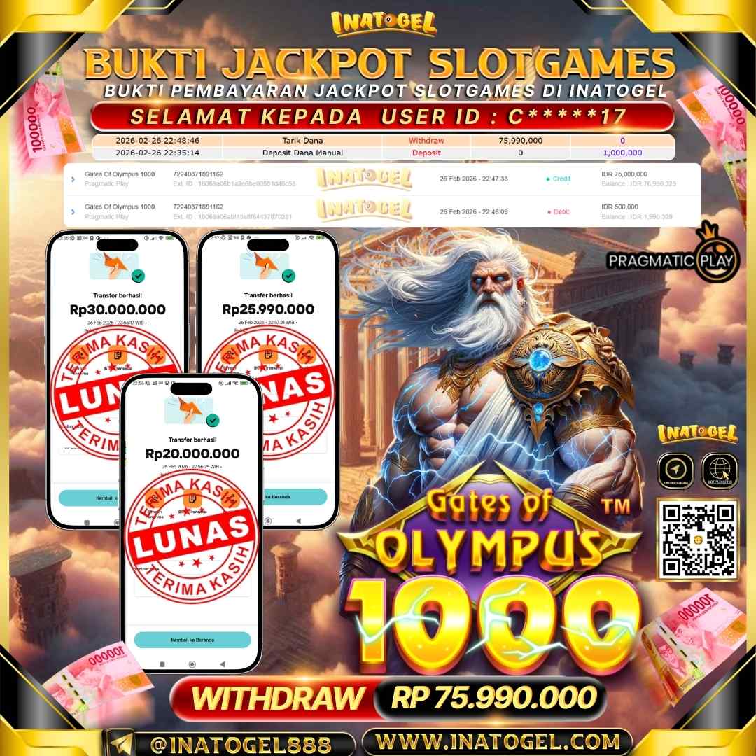 Selamat kepada User Id C*****17 telah berhasil mendapatkan kemenangan jackpot pada permainan Slot Games Gates Of Olympus 1000 sebesar Rp 75,990,000- . Inatogel situs terpercaya sejak dulu hingga saat ini , Untuk kemenangan berapapun pasti akan kami bayarkan . Jangan ragu bermain di Ina Togel . Kami pihak Inatogel Menyampaikan terima kasih kepada seluruh member Ina Togel yang telah Percaya dan setia Bersama kami bermain di Inatogel saat ini.