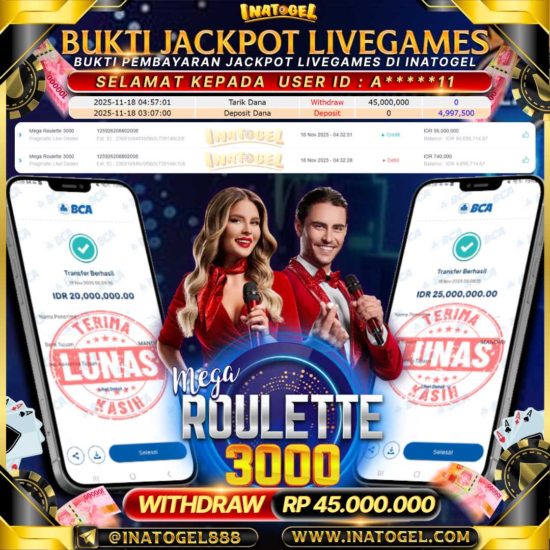 Inatogel Jackpot Live Games Mega Roulette 3000 Rp45,000,000