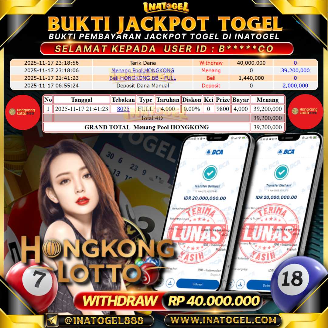 Inatogel Jackpot Togel Hongkong lotto Rp40,000,000