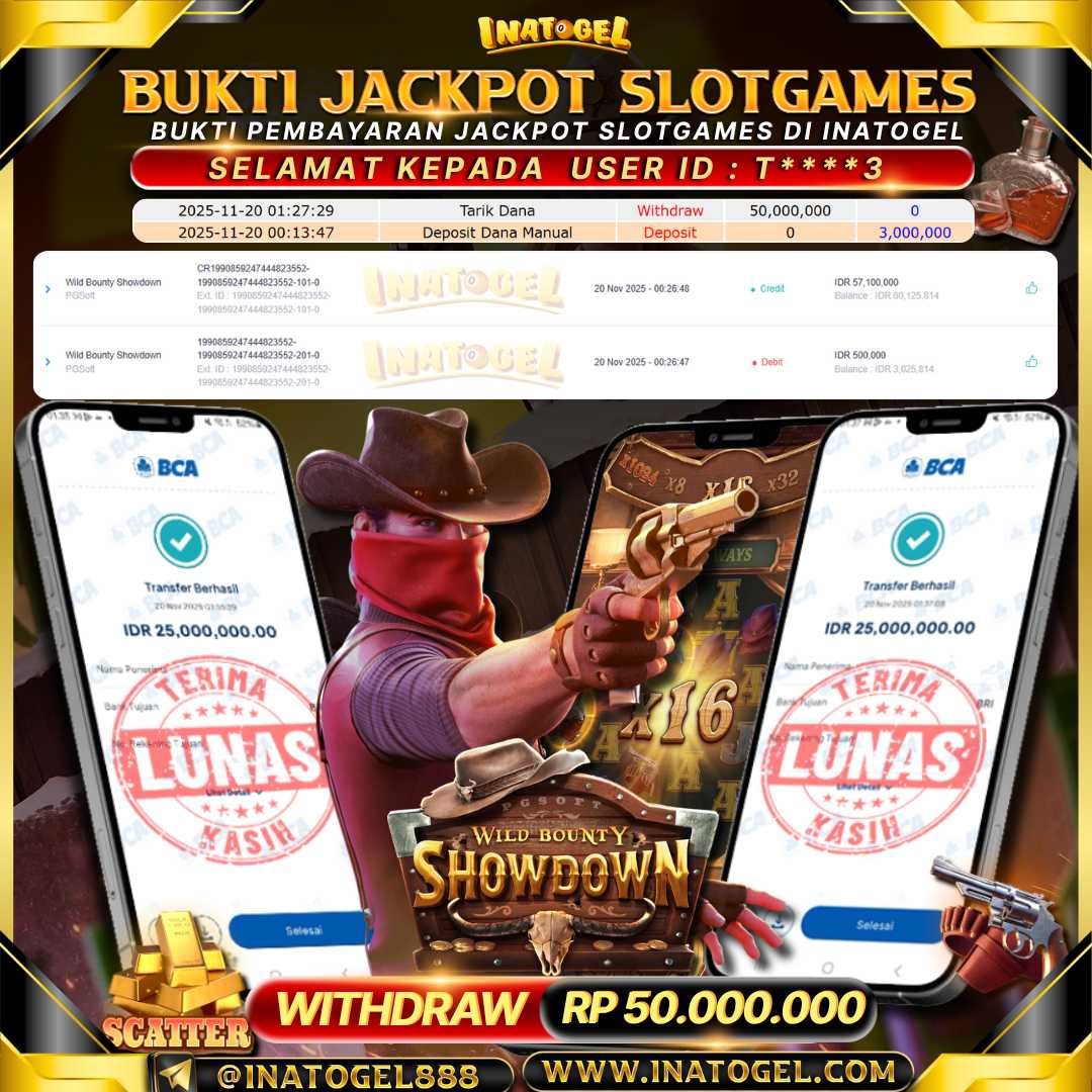 Selamat kepada User Id T****3 telah berhasil mendapatkan kemenangan jackpot pada permainan SlotGame Wild Bounty Showdown sebesar Rp50,000,000,- . Inatogel situs terpercaya sejak dulu hingga saat ini , Untuk kemenangan berapapun pasti akan kami bayarkan . Jangan ragu bermain di Ina Togel . Kami pihak Inatogel Menyampaikan terima kasih kepada seluruh member Ina Togel yang telah Percaya dan setia Bersama kami bermain di Inatogel saat ini.